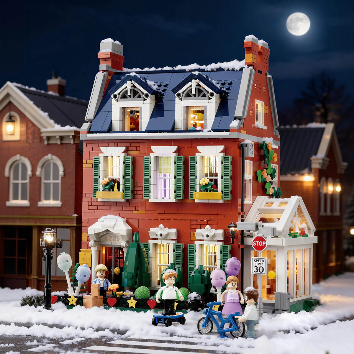 Die Fassade des Gebäudes ist ein echter Hingucker: Der authentische „Red Brick“-Farbton verleiht dem Haus eine unverwechselbare Textur, die es von anderen Modular Buildings abhebt. Liebevolle Details wie die Hausnummer 1225, ein gepflegter Vorgarten mit Topfpflanzen, ein klassischer Hydrant und eine stilvolle Strassenlaterne runden das äussere Erscheinungsbild ab. Die modulare Bauweise erlaubt es, die einzelnen Stockwerke mühelos abzunehmen, um das Innenleben zu erkunden.