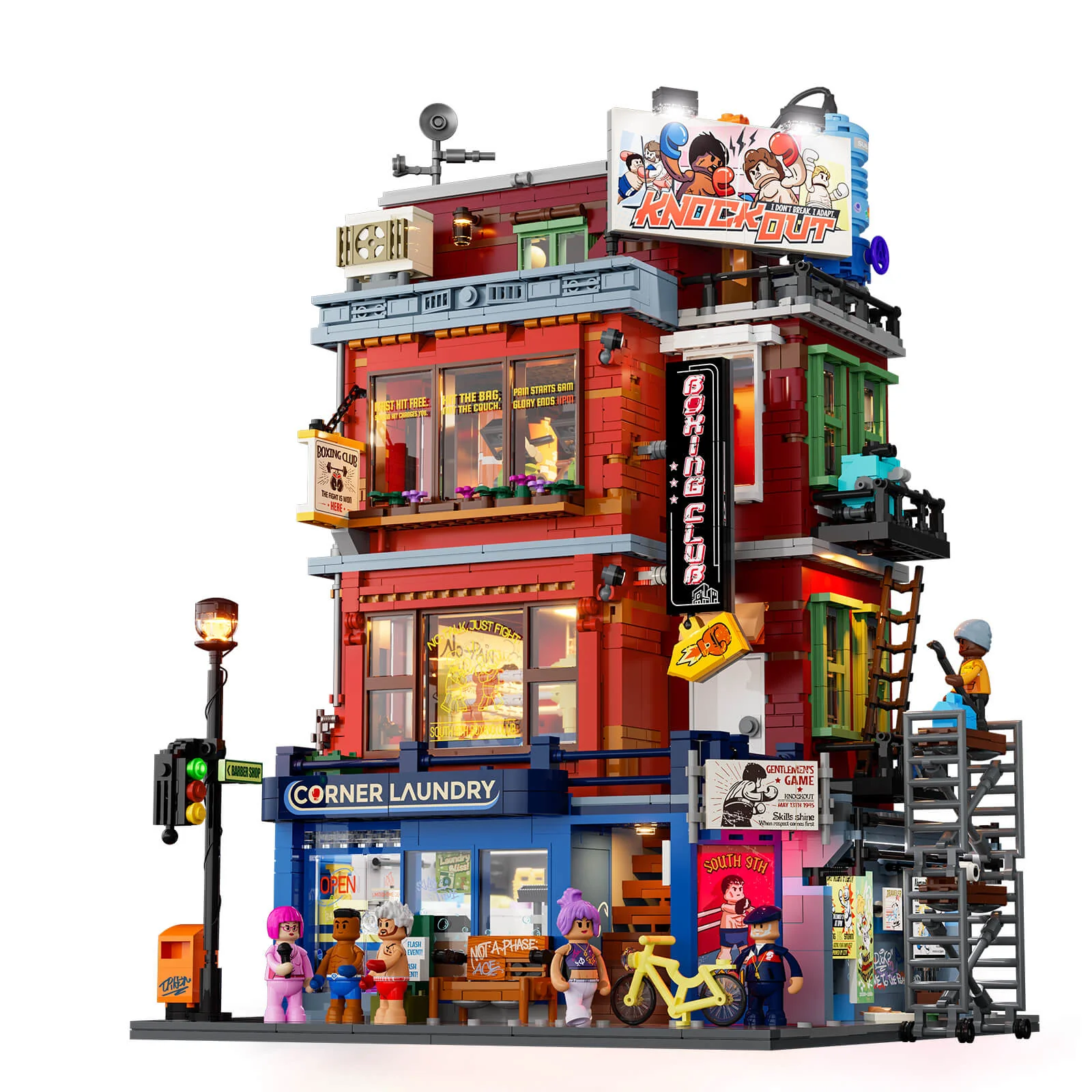 Über 90 bedruckte Elemente (Prints) verleihen dem Set seinen authentischen Street-Style. Von Graffiti über Schilder bis zu Plakaten – alles ist dauerhaft auf die Steine gedruckt. Das Zugangskonzept überzeugt: Grosse Türen an der Rückseite jeder Etage sowie drei herausnehmbare Sektionen ermöglichen vollen Zugriff. Die Stockwerke lassen sich einzeln abnehmen, wobei das Türsystem besonders elegant gelöst ist. Sechs charakterstarke Minifiguren – von Boxern über Trainer bis zu Zuschauern – beleben die Szenerie.