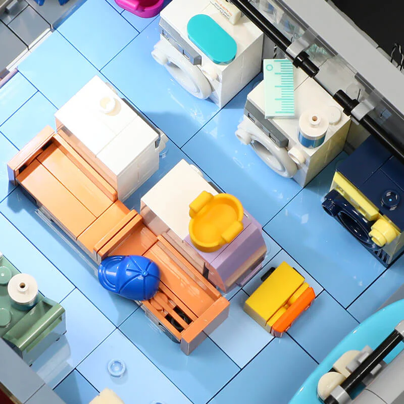 Im Erdgeschoss befindet sich ein Waschsalon (Laundromat) mit funktionierenden Waschmaschinen – ein unerwartetes, aber authentisches Detail. Über die Treppe gelangt man in den ersten Stock, wo der legendäre Boxring mit drehbarer Plattform auf Kämpfer wartet. Umkleidekabinen können herausgenommen werden und bieten Platz für Bänke und Spinde. Der zweite Stock beherbergt den Haupttrainingsbereich mit Sandsäcken, Speedbags, Springseil-Zone und diversen Fitnessgeräten – alles auf Noppen befestigt und frei positionierbar. Ganz oben im dritten Stock befindet sich ein kleinerer Kraftraum mit Gewichten und einer klappbaren Hantelbank. Die clever gestaltete Raumaufteilung wirkt deutlich durchdachter als bei vielen anderen Modular Buildings.