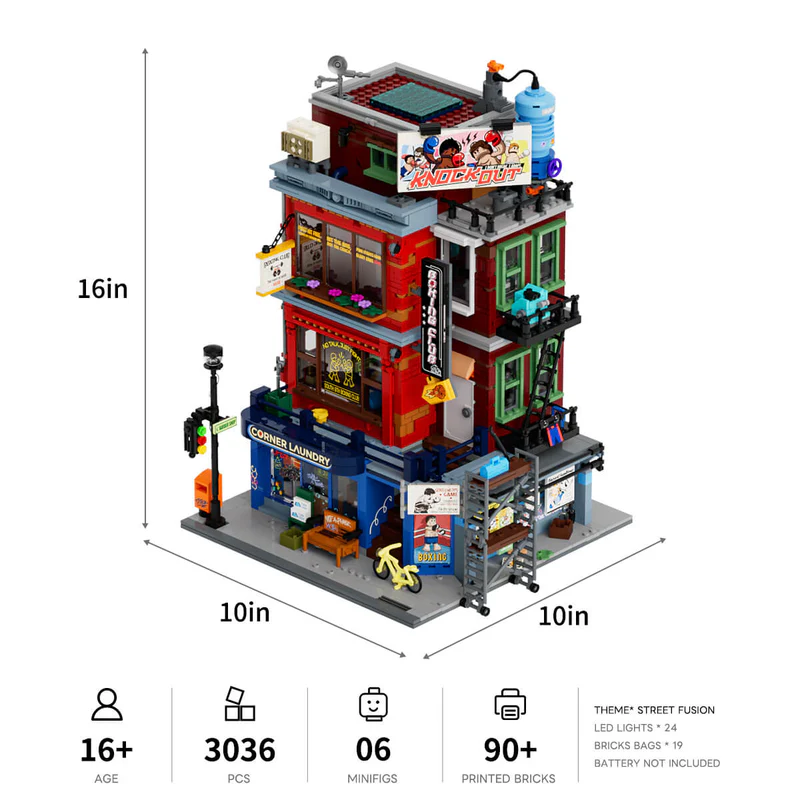 Der Boxing Club ist das perfekte Set für alle, die urbane Kultur, Sportgeschichte und hochdetaillierte Architektur schätzen. Er vereint rauen Strassen-Charme mit modernem Modellbau und ist ein beeindruckendes Statement-Piece in jeder Sammlung.