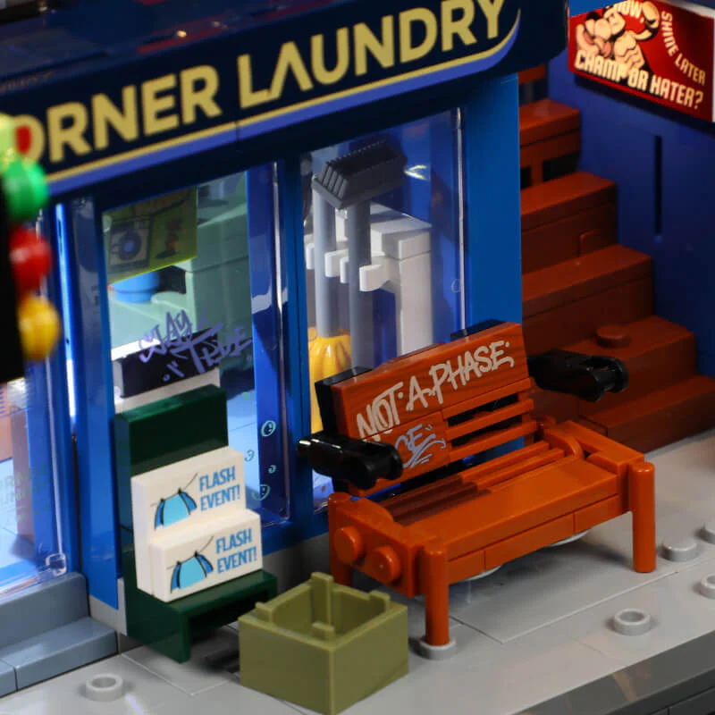 Mit sage und schreibe 24 LED-Lichtpunkten setzt dieses Set neue Massstäbe. Ein cleverer Schalter mit drei Einstellungen erlaubt verschiedene Modi: Aus, konstant hell und pulsierend. Im dritten Modus erzeugen rote und weisse Lichter einen atmenden Effekt, der perfekt zur Trainingsatmosphäre passt. Ampeln und Strassenlaternen vor dem Gebäude sind beleuchtet, und selbst die Hintergasse verfügt über stimmungsvolle Spots. Ein kleines Rätsel gibt die Verkabelung auf: Ein umgedrehter Lichtstreifen endet unter einem Mülleimer, was eventuell ein Designfehler oder eine kreative Lösung für zu lange Kabel sein könnte.