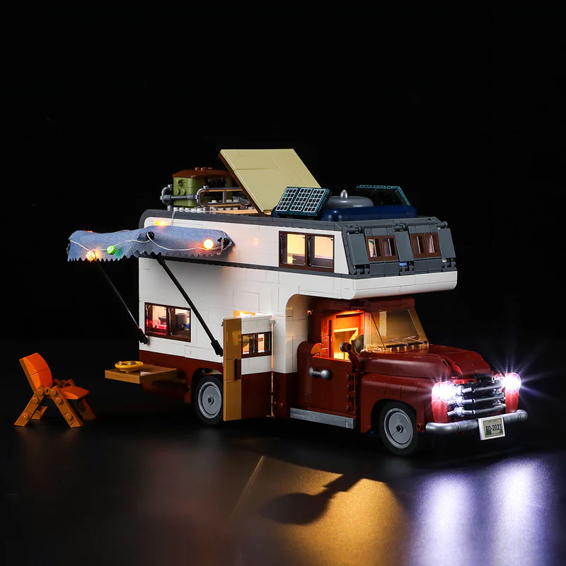 Das Highlight dieses Sets ist das massgeschneiderte LED-Lichtsystem. Sobald die Sonne untergeht, tauchen warmweisse Lichter den Innenraum und den Aussenbereich in eine behagliche Atmosphäre. Die Beleuchtung ist so integriert, dass sie das nostalgische Flair des Fahrzeugs unterstreicht und Details wie den Essbereich oder die Schlafkoje perfekt in Szene setzt. Geniessen Sie den Anblick Ihres beleuchteten Campers und träumen Sie sich an Ihren nächsten Urlaubsort.