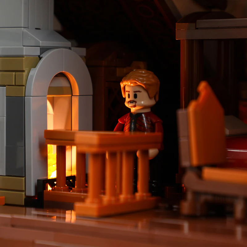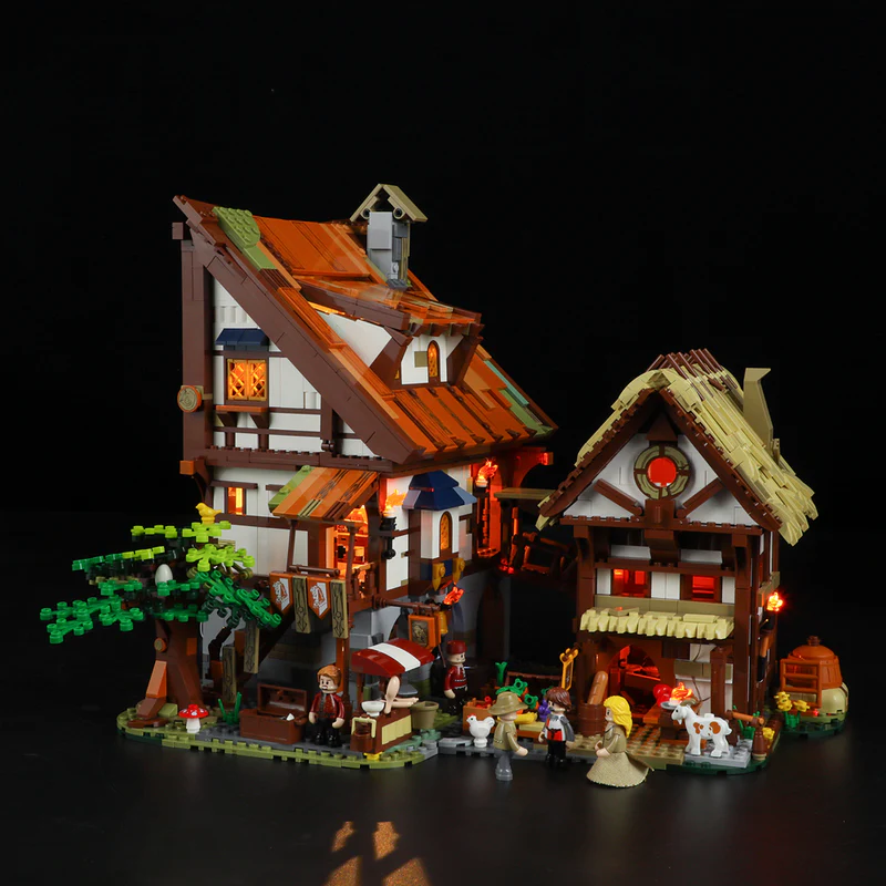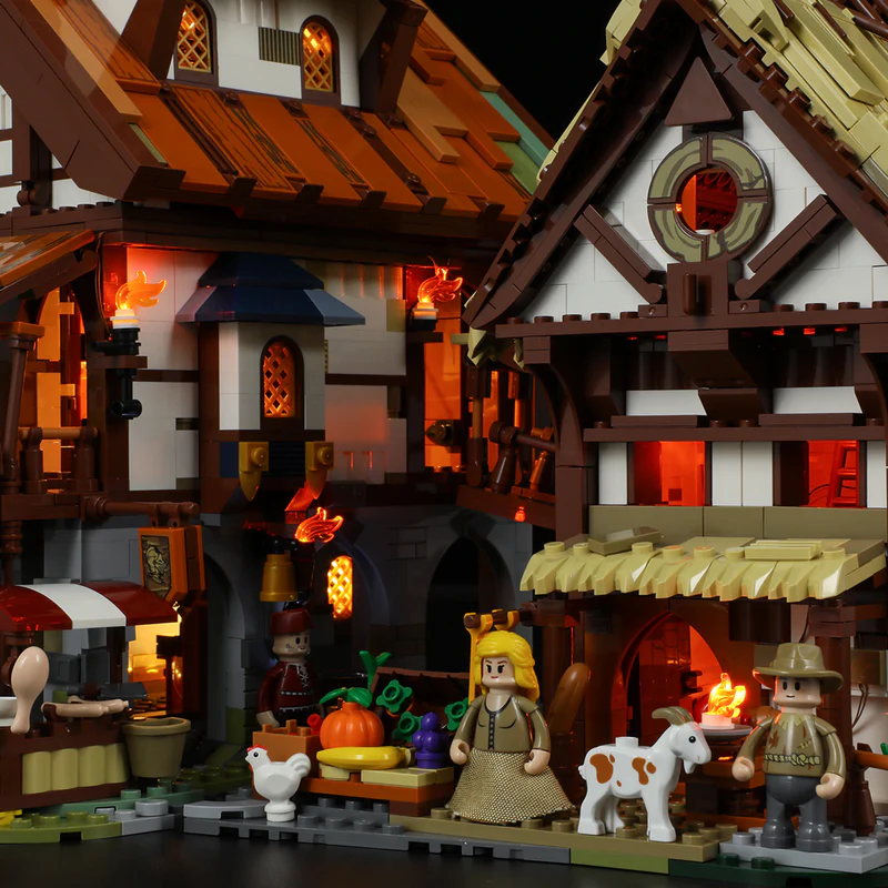 Ein Highlight dieses Bausatzes ist das ausgeklügelte Beleuchtungskonzept. Lumibricks liefert ein massgeschneidertes LED-Licht-Set mit, das die Marktszenerie in den Abendstunden in ein warmes, gemütliches Licht taucht. Flackernde Fackeln an den Hauswänden, beleuchtete Fenster und der Schein der Schmiedefeuer sorgen für eine unvergleichliche Atmosphäre. Die Verkabelung ist dabei so geschickt in die Konstruktion integriert, dass sie das historische Gesamtbild nicht stört, sondern perfekt ergänzt.