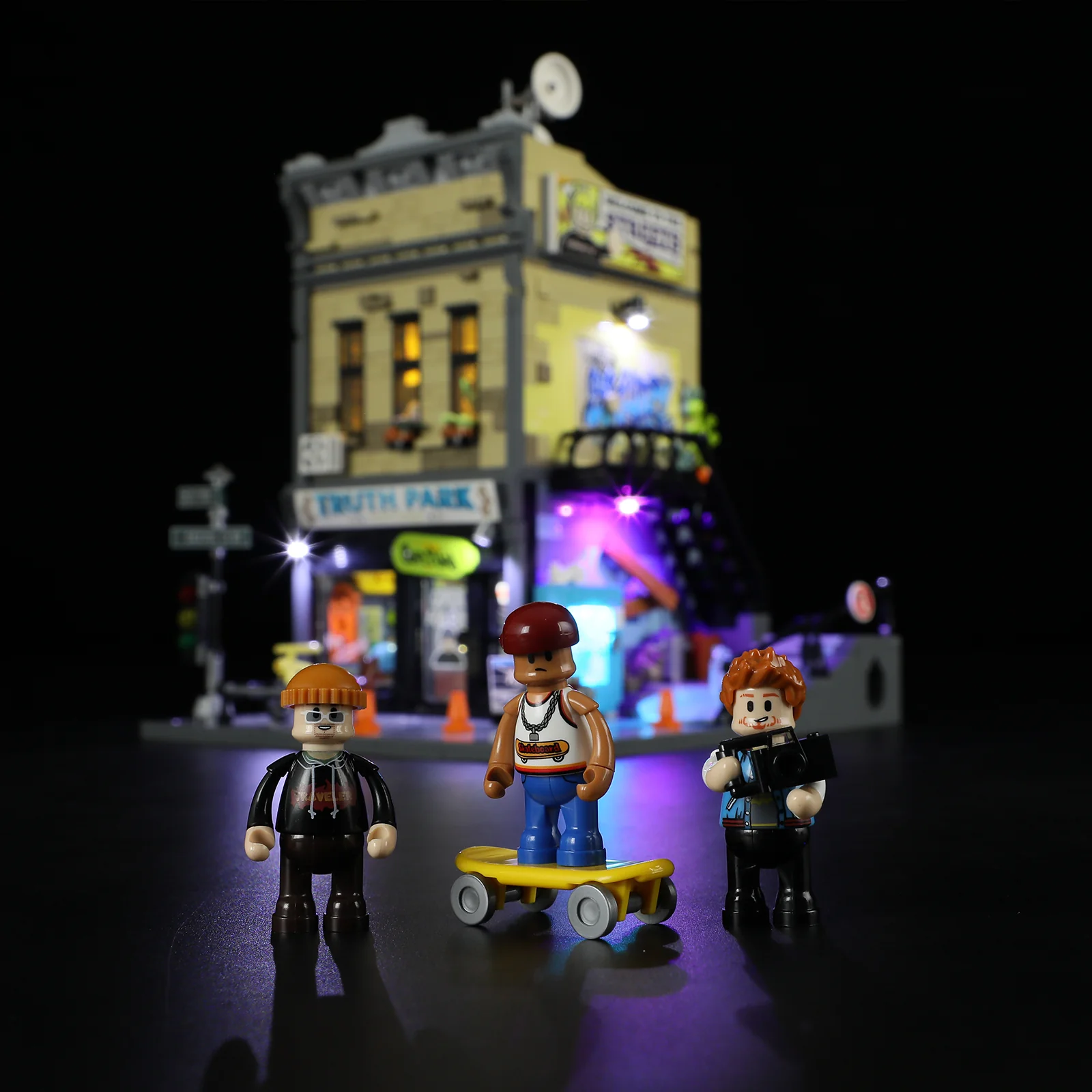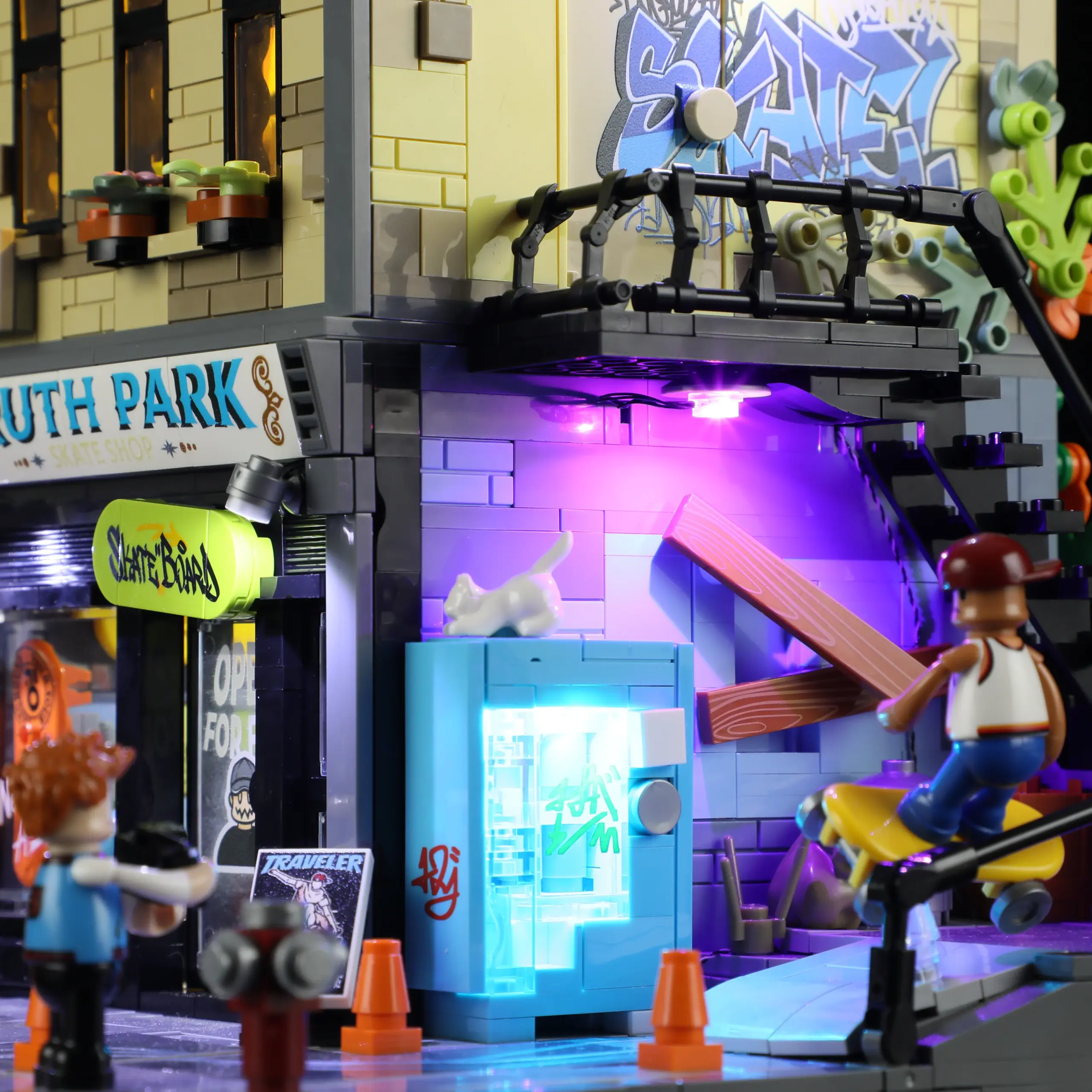 Acht strategisch platzierte LED-Lichtpunkte tauchen das Set in stimmungsvolles Licht. Die Lichtleisten mit warmem, diffusem Glow verwandeln die Szene von einem Tages-Display in eine vibrierende nächtliche Stadtansicht. Vom beleuchteten Shop-Interieur über das gemütliche Schlafzimmer bis zur Dach-Session – jeder Bereich hat seine eigene Atmosphäre. Ein cleveres Verkabelungssystem ermöglicht es, die Stockwerke zu entfernen, ohne die Lichter zu stören. Die Verbindungen zwischen den Etagen sind so gestaltet, dass keine Kabel im Weg sind. USB-Stromversorgung sorgt für konstante Beleuchtung.