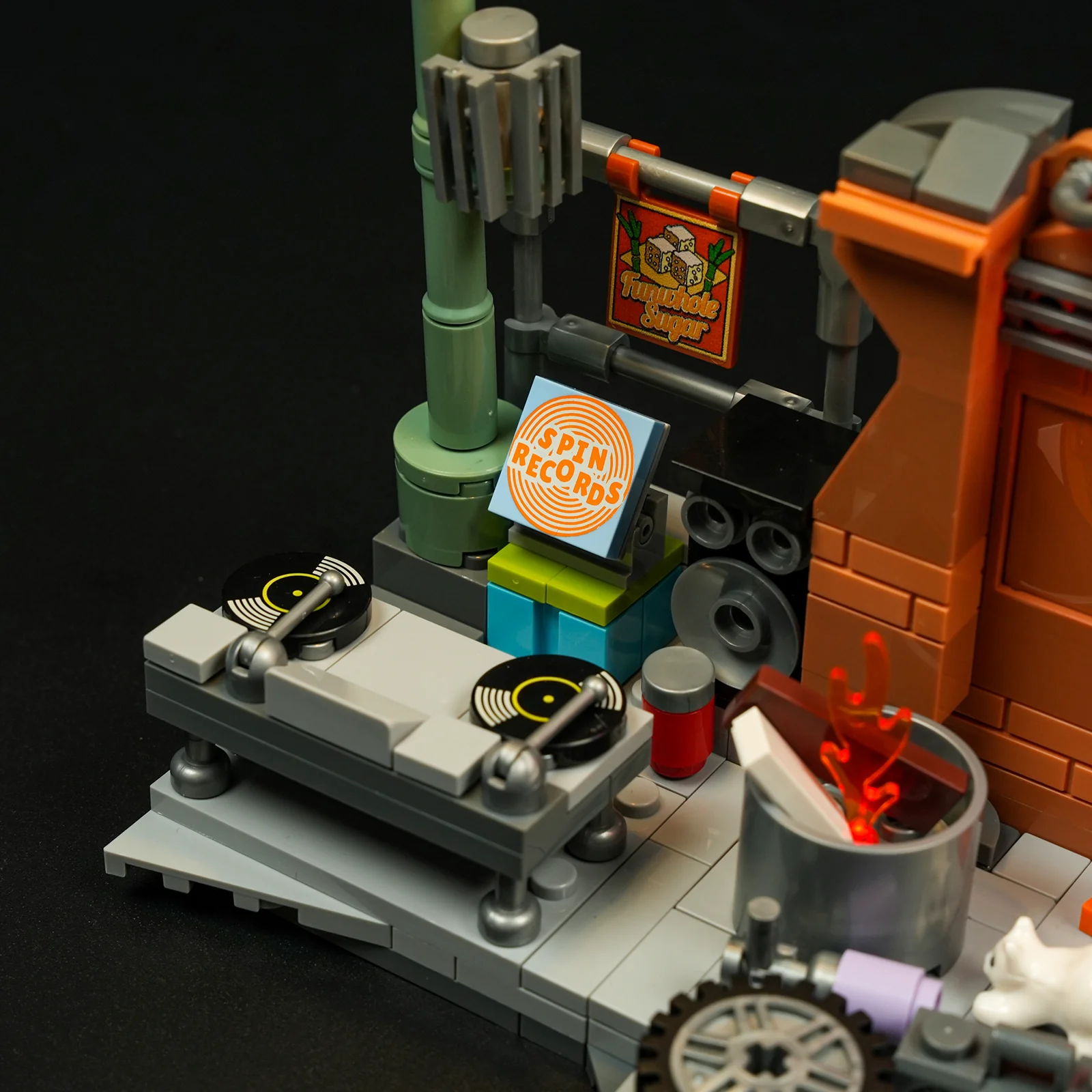 Die Rückwand des Sets ist ein Kunstwerk für sich: Üppige Graffiti-Elemente in leuchtenden Farben schaffen eine authentische Hip-Hop-Atmosphäre. Über 18 bedruckte Steine zeigen verschiedene Tags, Schriftzüge und Street-Art-Motive – ganz ohne Aufkleber. Eine DJ-Booth steht bereit, um die Beats zu liefern, komplett mit Plattenspieler-Elementen und Lautsprecherboxen. Das Setup kann wahlweise links oder rechts positioniert werden und lässt sich sogar als freistehendes Element nutzen. Eine brennende Mülltonne sorgt für zusätzliche Atmosphäre und wird durch LEDs zum Leuchten gebracht.