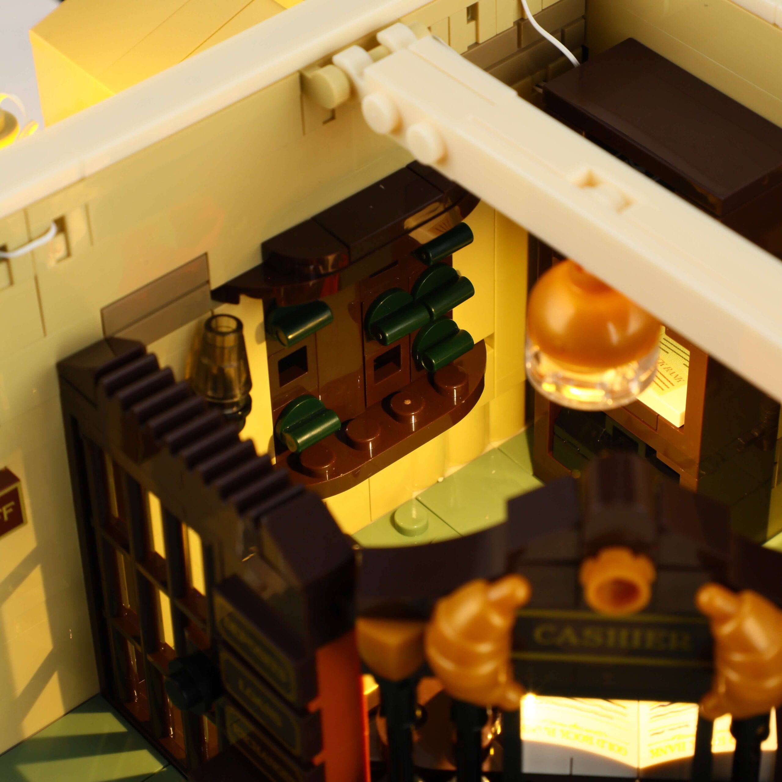 Das Set verfügt über ein beeindruckendes Beleuchtungssystem mit 11 Lichtpunkten und 6 Lichtstreifen. Die Highlights sind die realistischen Explosions-Beleuchtungseffekte, die das Chaos eines Banküberfalls perfekt simulieren. Innenbeleuchtung in allen drei Etagen, Außenlaternen und strategisch platzierte Akzentlichter tauchen das Gebäude in atmosphärisches Licht. Die meisterhaft arrangierten Lichter heben zahlreiche Details hervor und machen das Set bei Tag und Nacht zum Blickfang.