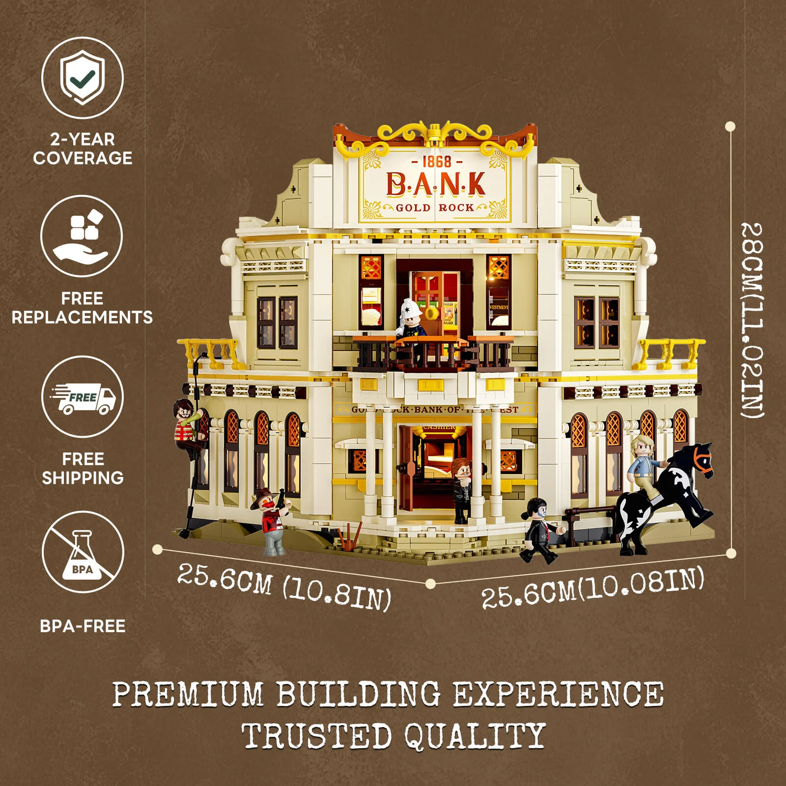 Mit beeindruckenden 51 perfekt bedruckten Elementen folgt dieses Set der Lumibricks-Tradition und verzichtet vollständig auf Aufkleber. Die Fassade zeigt verwitterte Holzbretter, Werbeschilder, Fahndungsplakate und zahlreiche weitere authentische Western-Details. Sechs thematisch passende Minifiguren – Bankräuber, Bankwächter, Angestellte und ein Pferd – beleben die actiongeladene Szenerie. Die massiven Wände und die Dicke der Konstruktion verleihen dem Set beeindruckendes Gewicht und Stabilität.