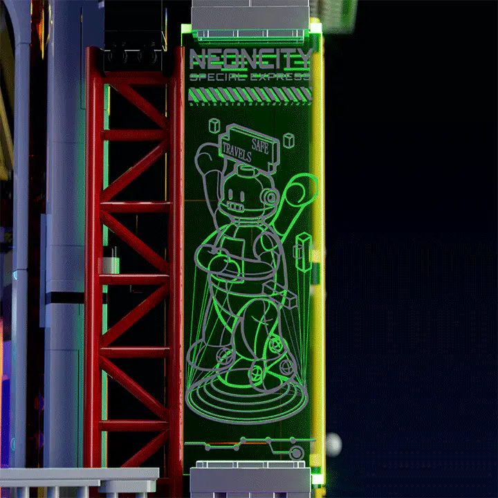 Mit 24 LED-Lichtpunkten und 12 Lichtstreifen setzt dieses Set neue Massstäbe in der Beleuchtungstechnik. Das absolute Highlight sind die mehrschichtigen Acrylplatten, die eine pseudo-animierte Werbetafel simulieren: Ein laufender Mann scheint sich zu bewegen, während ein blinkendes Eiscreme-Schild zum Verweilen einlädt. Eine mehrfarbige, pulsierende Stoppschild-Anzeige und ein „unendlicher Portal“-Effekt mit verspiegelten Rückwänden erzeugen optische Illusionen, die man sonst nur aus Science-Fiction-Filmen kennt. Die massgeschneiderten Acrylpaneele mit ihren holografischen Effekten und das unsichtbare Kabelmanagement sorgen dafür, dass die Zukunft zum Greifen nah wirkt.
